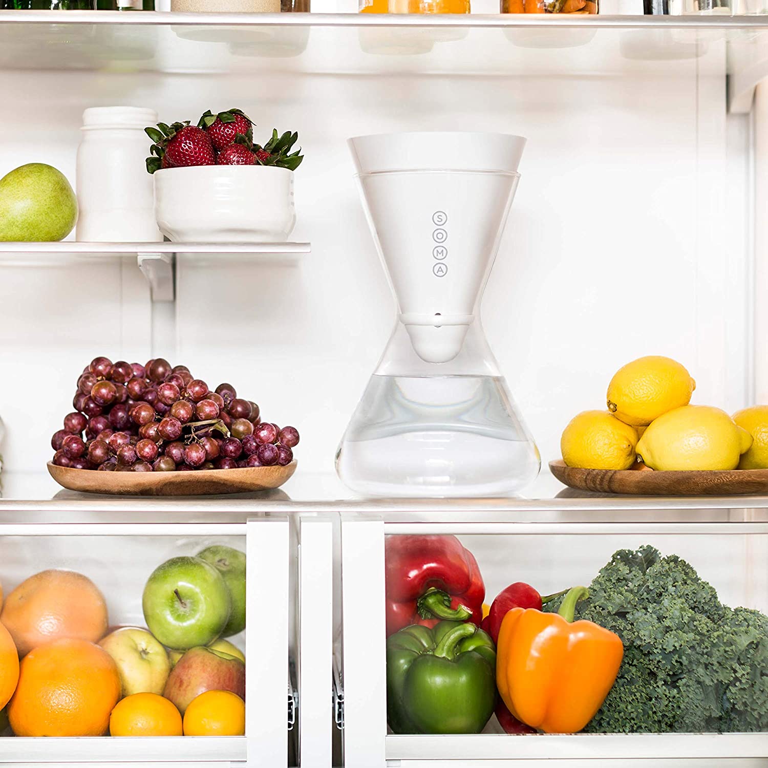 Stylish contemporary design meets high-quality functionality with this 6-cup Soma pitcher. It fits neatly in your fridge and when brought to the table chilled it can serve up to six cups of filtered water.