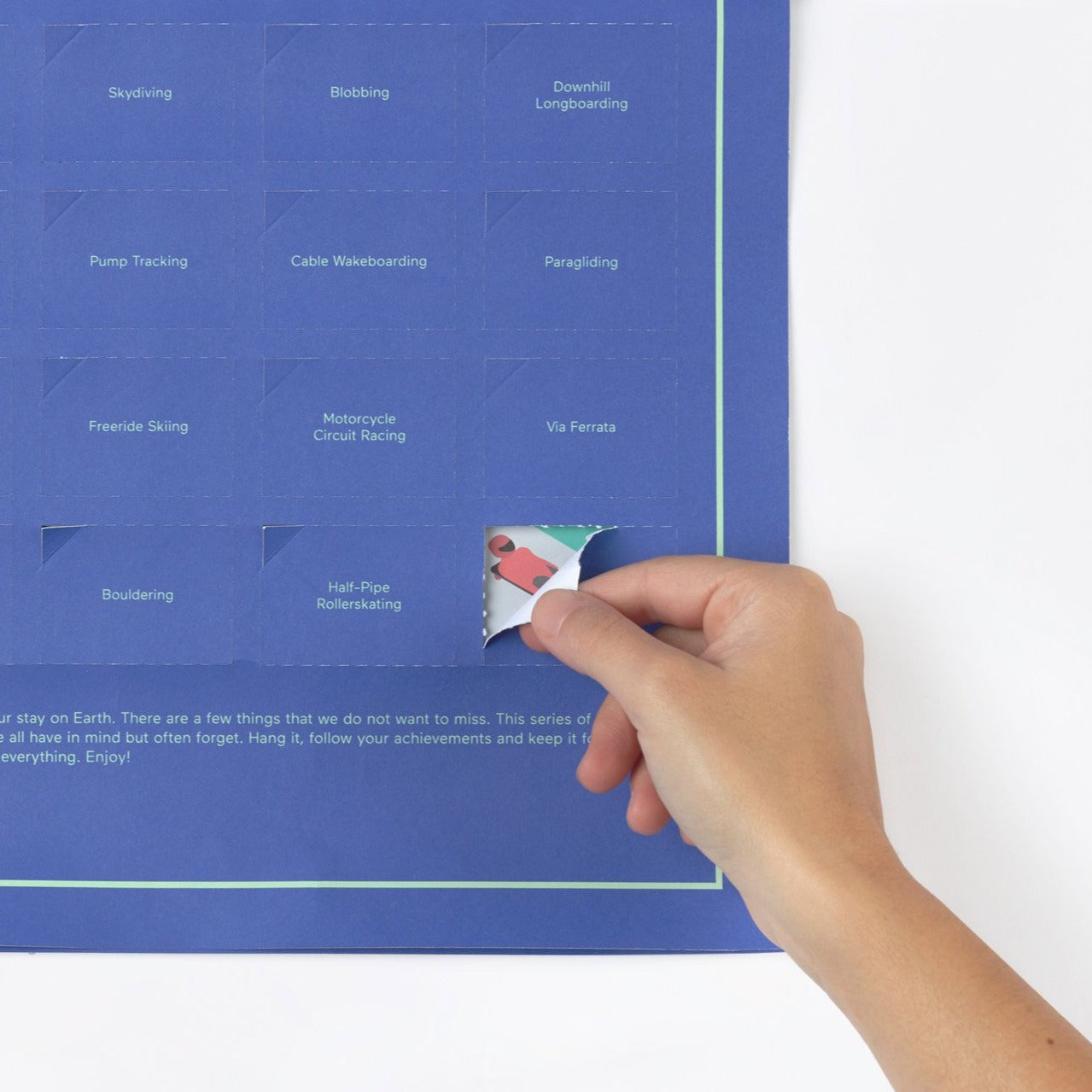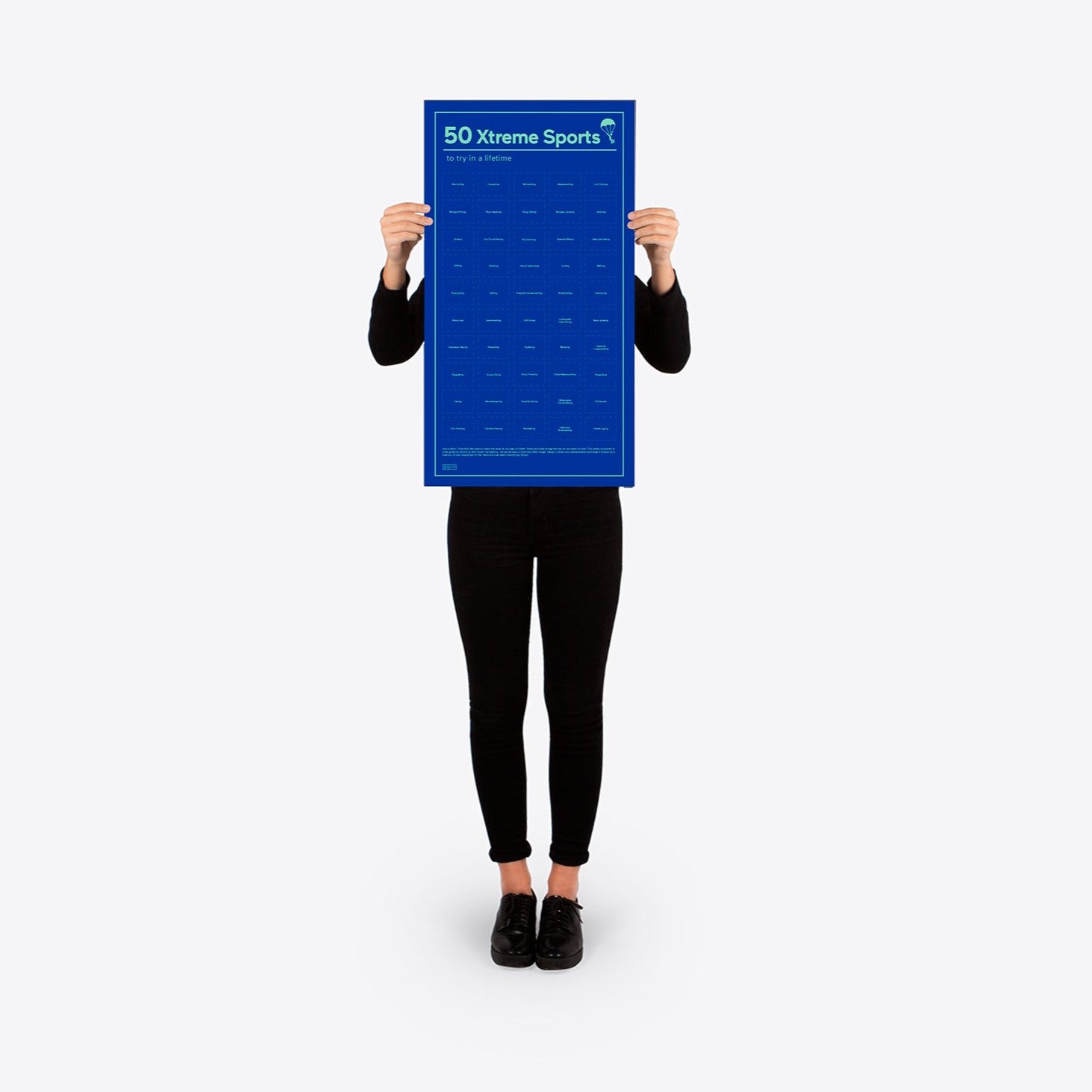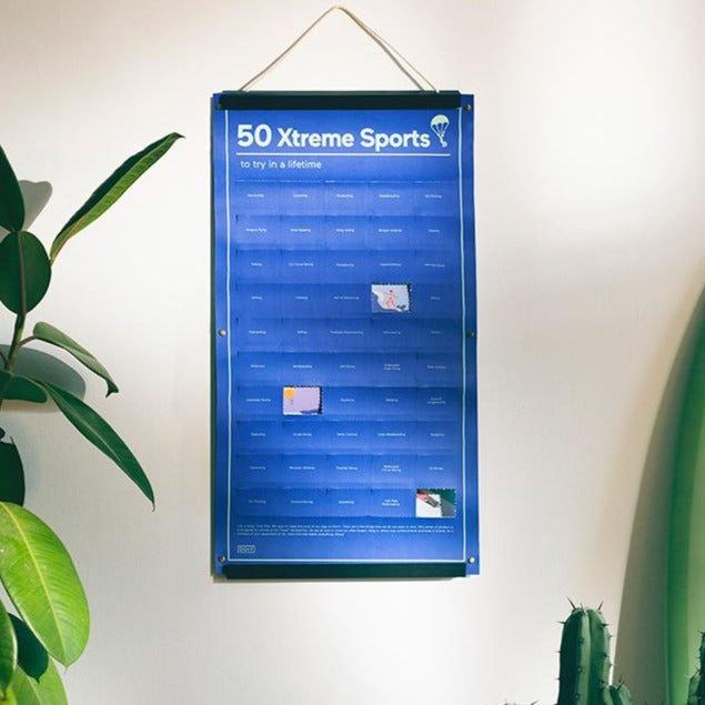 Whether sand or kite surfing, ice climbing, bouldering or bungee jumping. This interactive poster is a compilation of 50 extreme sports you must have to do! Hang up the poster, track your progress and keep your experiences in mind forever. So bring the poster to life and do some sport through the world of Xtreme Sports and open up field by field.