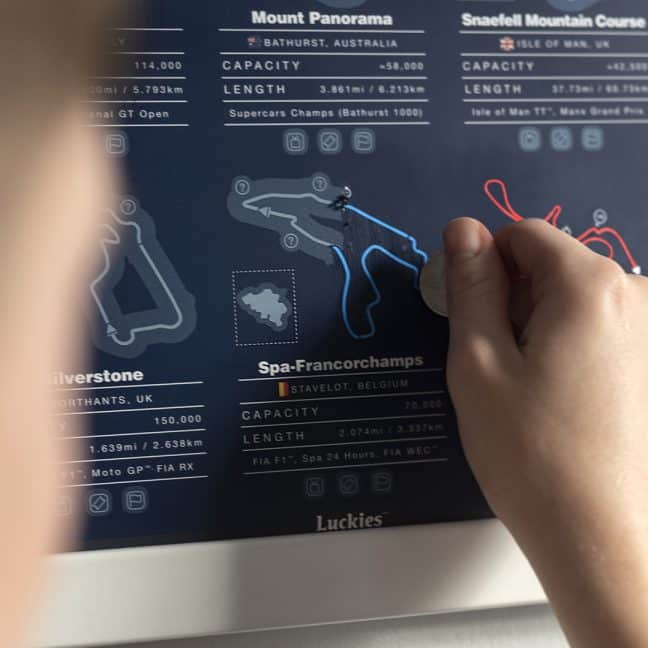 Every petrolhead will want this smart Scratch Fuel Race Track Poster by Luckies of London. Simply remove the foil to reveal 24 of the world’s most famous car and motorbike circuits and rack up facts using the accompanying 32 page booklet. With striking graphics and iconic colours, this poster covers multiple races and events, from Silverstone to Suzuka, and Indianapolis to Imola. Whether you’ve watched, visited or driven each track, scratch away to reveal extra facts and details to fine-tune your circuit.