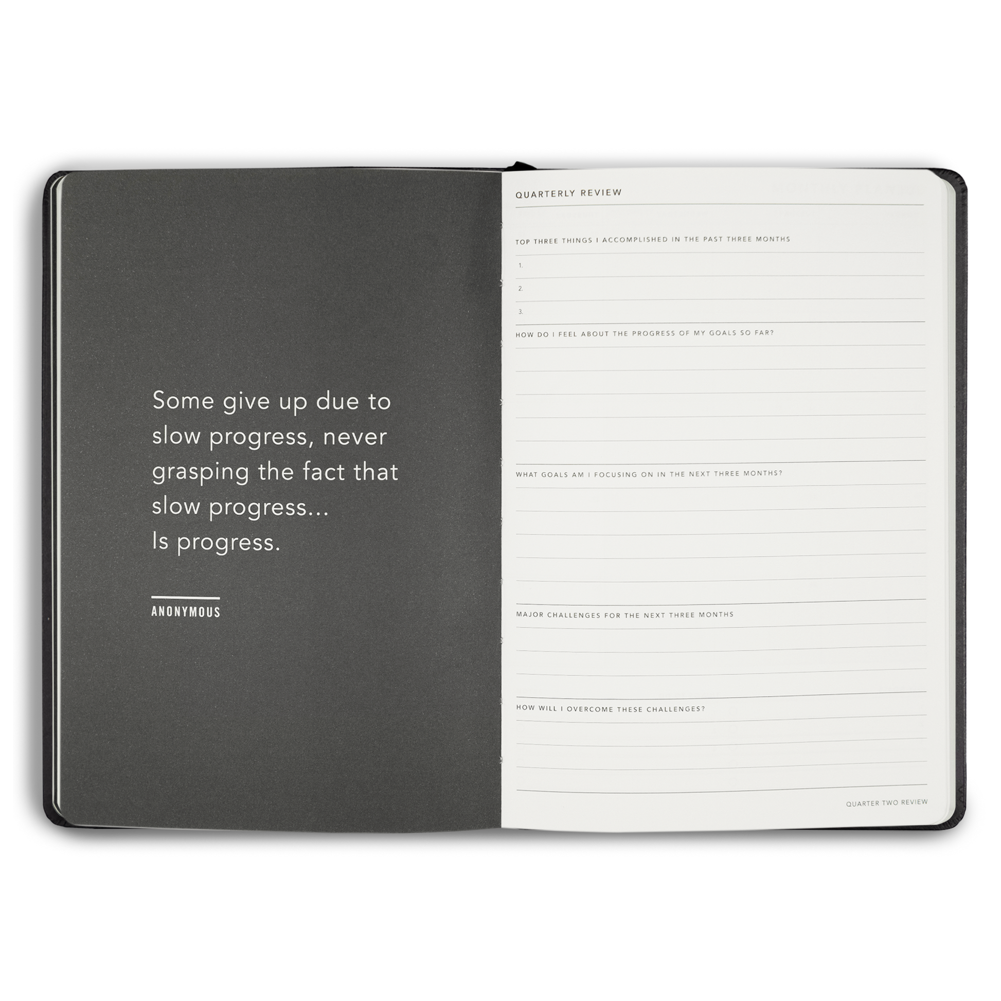 Description Size: A5 Size: 14.8 x 21.0 x 2cm. Debossed Artwork cover, FSC certified paper. Sections for purpose and vision planning, 10 x Goal setting templates (6 x Short 4 x Long), Quarterly reviews section to track your progress, Week to two-page diary spread with habits tracker, Monthly calendar planner, Monthly budget section, Lined note pages.