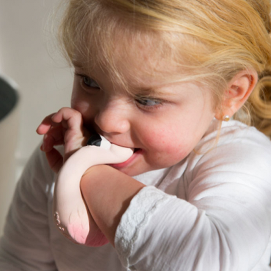 Sky the Flamingo has traveled from the crystal clear water tropical island to play with babies and kids and to be their favorite teether, bath toy and sensory play toy. It is meant to be placed around babies’ wrists while chewing on it!