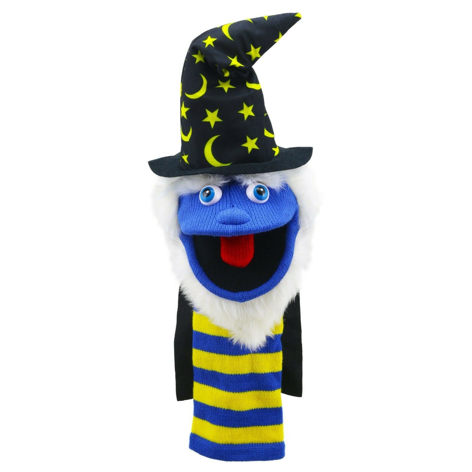 This is Wizard from the Sockettes range by the Puppet Company. Wizard is the most magical monster you can find! With a mystical hat covered in shiny moons and stars, a long white beard and cape! Finished with blue and yellow stripes!