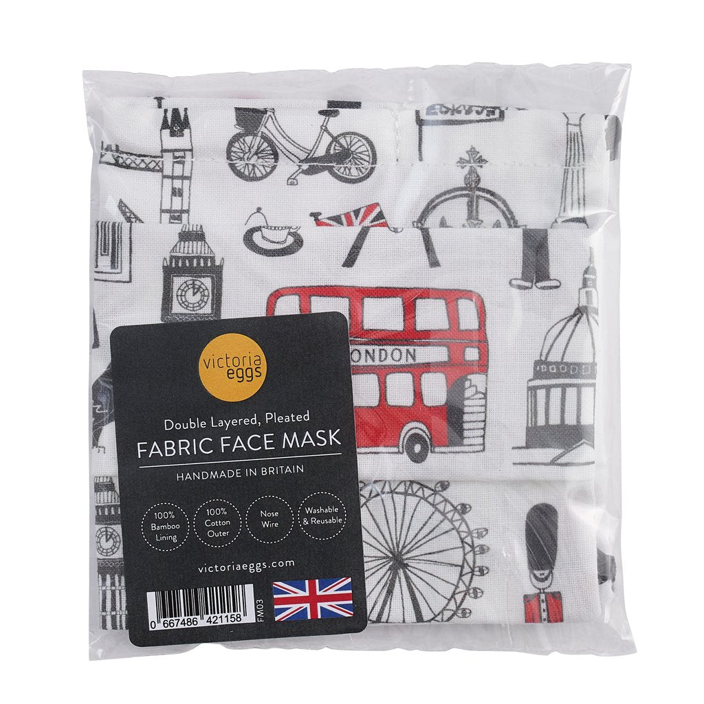 The double layered re-usable fabric face masks by Victoria Eggs are printed onto 100% tightly woven cotton outer and 100% bamboo inner lining for softness against the face. Complete with an adjustable nose wire for a better fit.