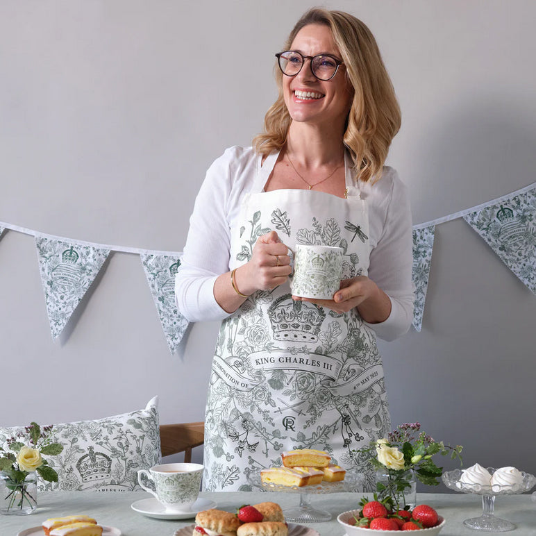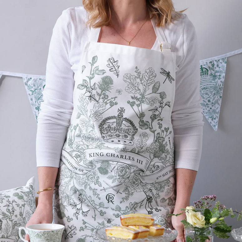 Celebrate Britain's heritage with the intricate Victoria Eggs King Charles III Coronation Apron. Handmade in the UK and hand-drawn with exquisite detail, it bears the National flowers from the UK along with oak, a symbol of strength and stability, and Ivy, the symbol of commitment. With subtle nods to the King's life hidden amidst the wildlife and foliage: the eagle, swords, anchor; a parachute, pens and paintbrushes. A beautiful piece of art to honour His Majesty.