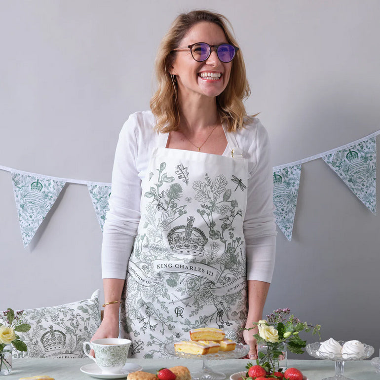 Description 60 cm wide x 85 cm high apron complete with adjustable neck tie. Handmade in the UK, printed onto 100% cotton. Machine washable at maximum 40 degrees celsius. Victoria Eggs King Charles III Coronation Apron.